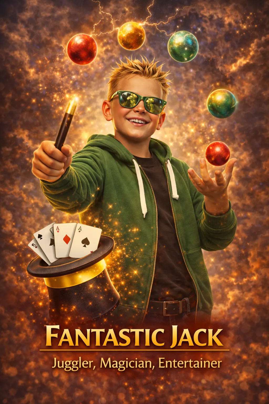 Jack’s growing skill set includes juggling, magic, comedy, balancing, basketball spinning, and advanced card throwing, all supported by strong creativity, dexterity, and showmanship. His performances aim to inspire audiences by demonstrating that confidence comes from competence and that extraordinary abilities are achievable through dedication. Through both live performances and his online presence, Jack encourages others to believe that with enough practice, anyone can become “amazingly fantastic.”