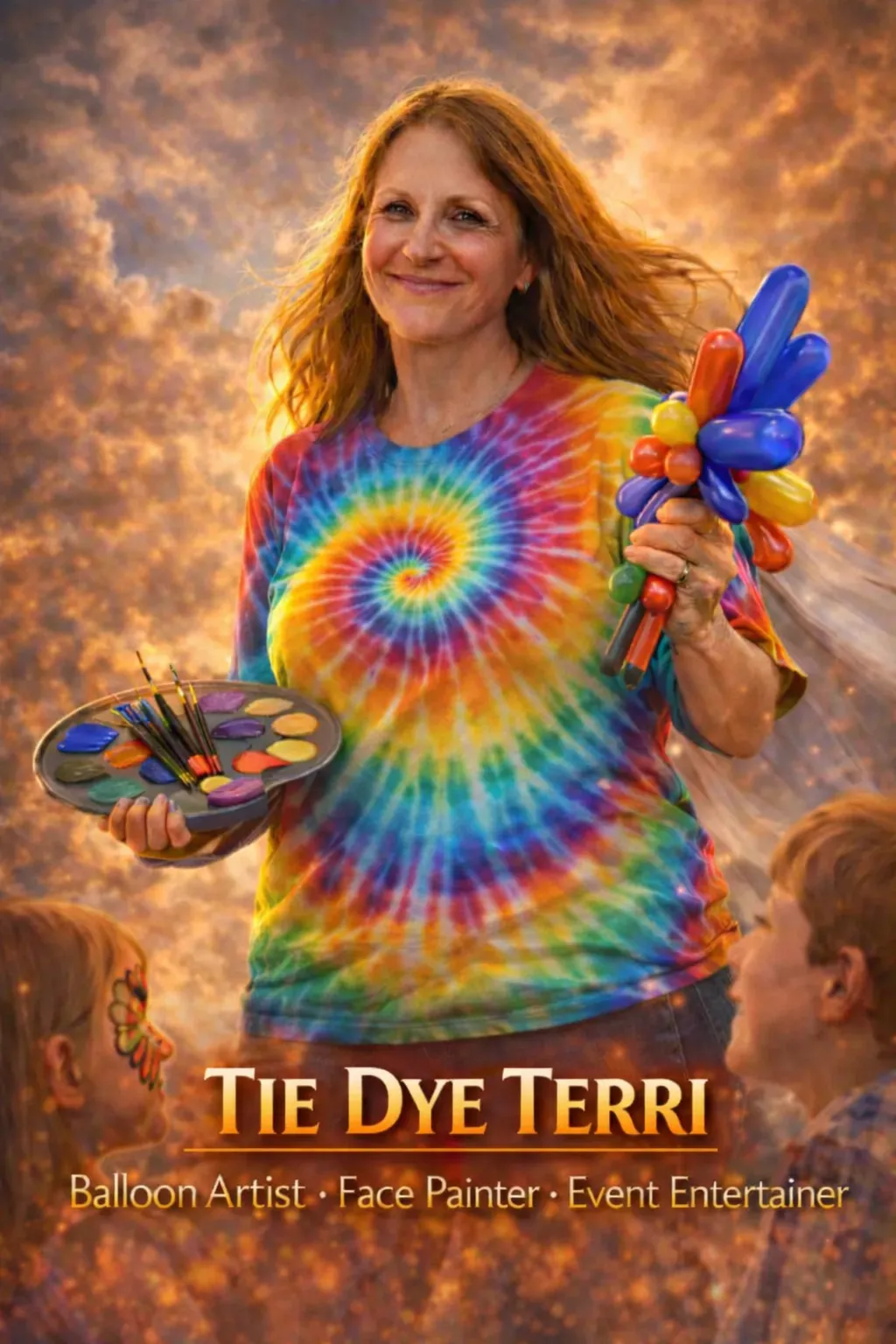 Tie-Dye Terri is a high-energy balloon artist and face painter known for transforming simple materials into colorful, imaginative creations that captivate audiences of all ages. With exceptional speed and creativity, she crafts everything from animals and hats to custom, one-of-a-kind balloon designs—often inventing them on the spot. Her interactive style and engaging personality turn any event into a lively, joy-filled experience.